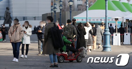 | 27일 서울역 광장에 마련된 신종 코로나바이러스 감염증(코로나19) 임시선별진료소에서 시민들이 검사를 받기 위해 줄 서서 대기하고 있다.2021.2.27/뉴스1 © News1 김진환 기자 |