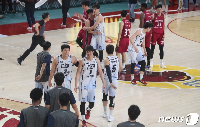 (창원=뉴스1) 여주연 기자 = 28일 오후 경남 창원실내체육관에서 열린 '2020~2021 현대모비스 프로농구' 창원 LG 세이커스와 전주 KCC 이지스 경기에서 82 대 73으로 승리를 거둔 전주 KCC 선수들이 기쁨을 나누고 있다. 2021.3.28/뉴스1
