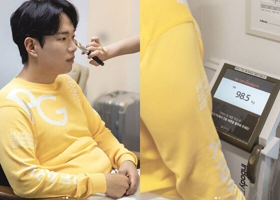 사진 속 장성규는 체중을 측정하고 난 후 분장을 하고 있다. 체중계에는 장성규의 몸무게가 98.5㎏으로 측정되고 있다.