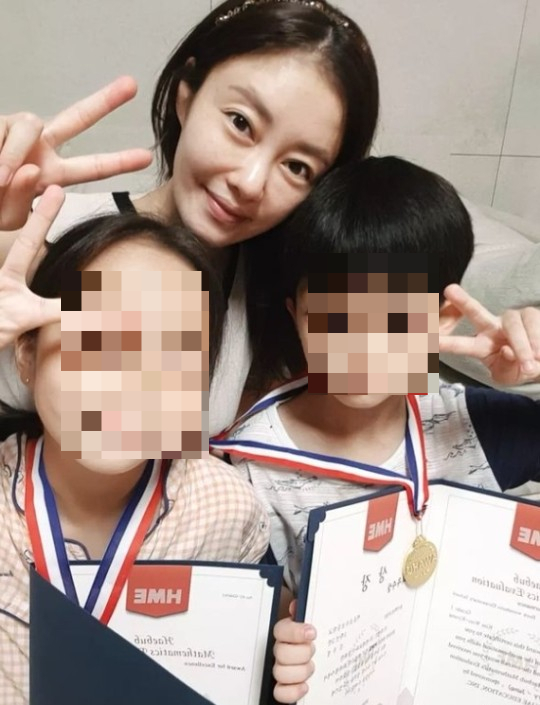 이지현은 두 아이와 함께 찍은 사진도 공개했다. 서윤이과 우경이는 모두 상장을 들고 목에는 메달을 멘 채 인증샷을 찍고 있다.