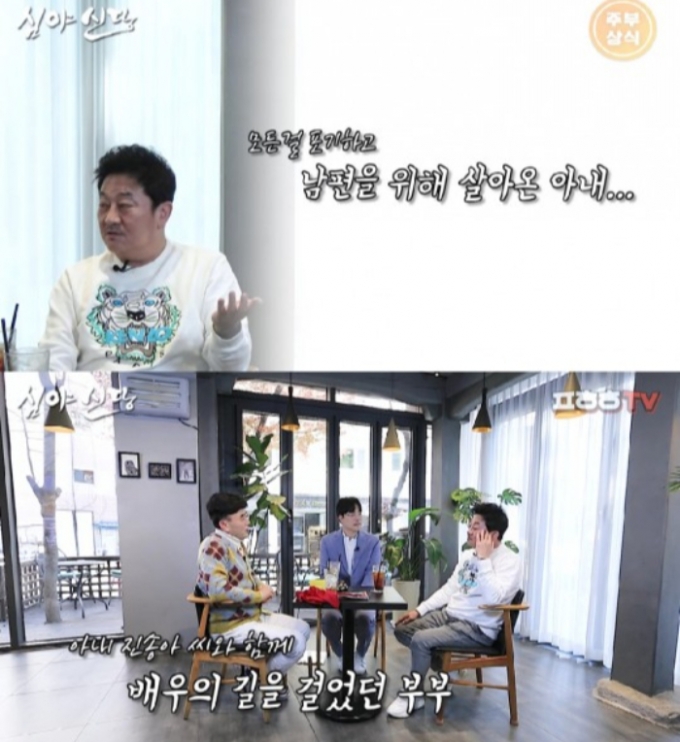 공황장애가 생긴 사연에 대해서는 "아내가 모든 걸 포기하고 나를 위해 살아왔다. 중앙대 연극영화과를 나와 함께 배우의 길을 걸었는데 아버지가 '집안에 배우는 한 명만 하라'고 해서 아내가 연기를 그만뒀다"고 밝혔다.